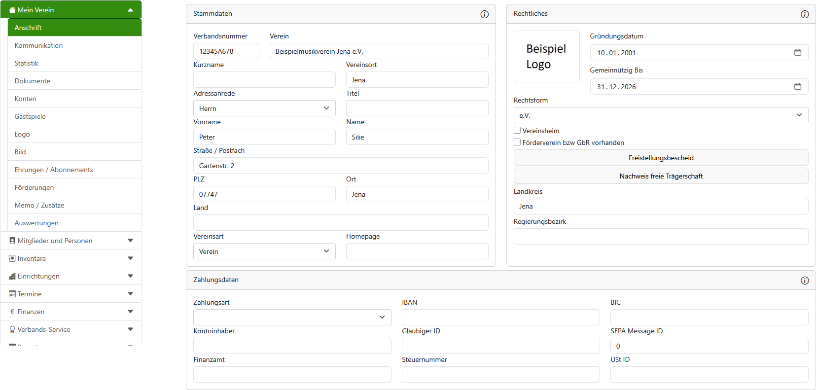 Tragen Sie im Register Anschrift alle notwendigen Daten für Ihren Verein ein.