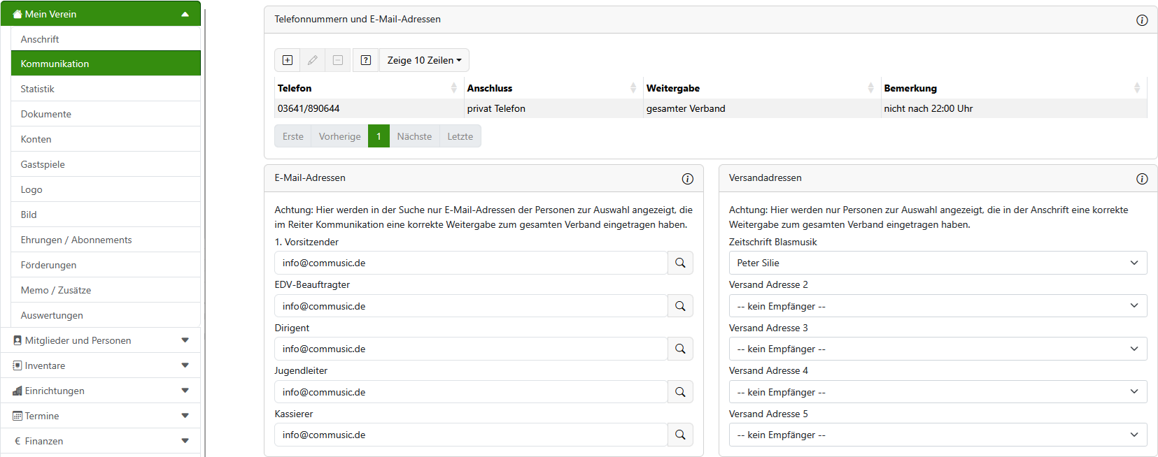Im Reiter Kommunikation tragen Sie mindestens eine Rufnummer ein. Füllen Sie auch die E-Mail-Adressen "1. Vorsitzender", "EDV-Beauftragter", "Dirigent", "Jugendleiter" und "Kassierer" aus. Über den Schalter können Sie dazu eine passende Person inklusive E-Mail-Adresse heraussuchen oder Sie füllen die Felder per Hand aus.