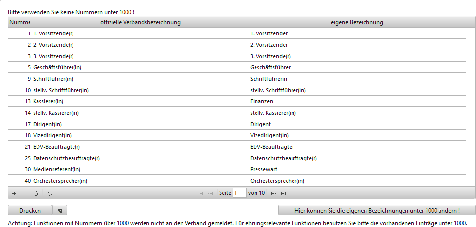 Ändern Sie so alle Ihre Funktionsbezeichnungen in der Spalte "Eigene Bezeichnung". Finden Sie eine Funktion nicht, so können Sie ab der lfd. Nummer 1000 weitere Funktionärsbezeichnungen (z.B. Instrumentenwart) hinzufügen.