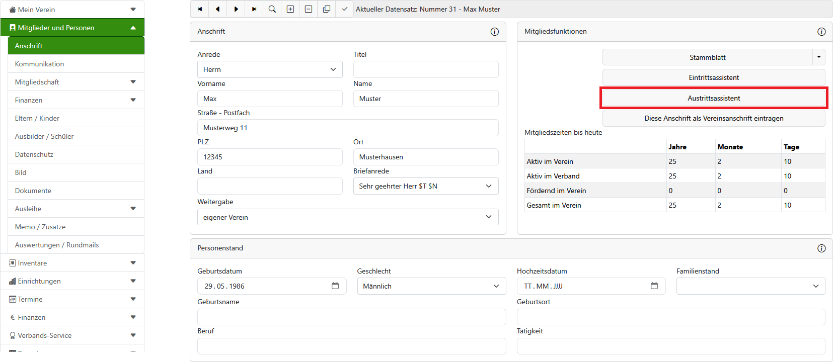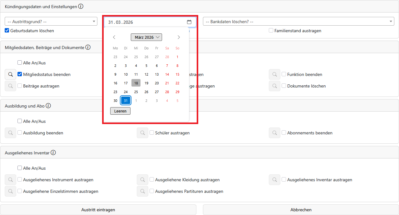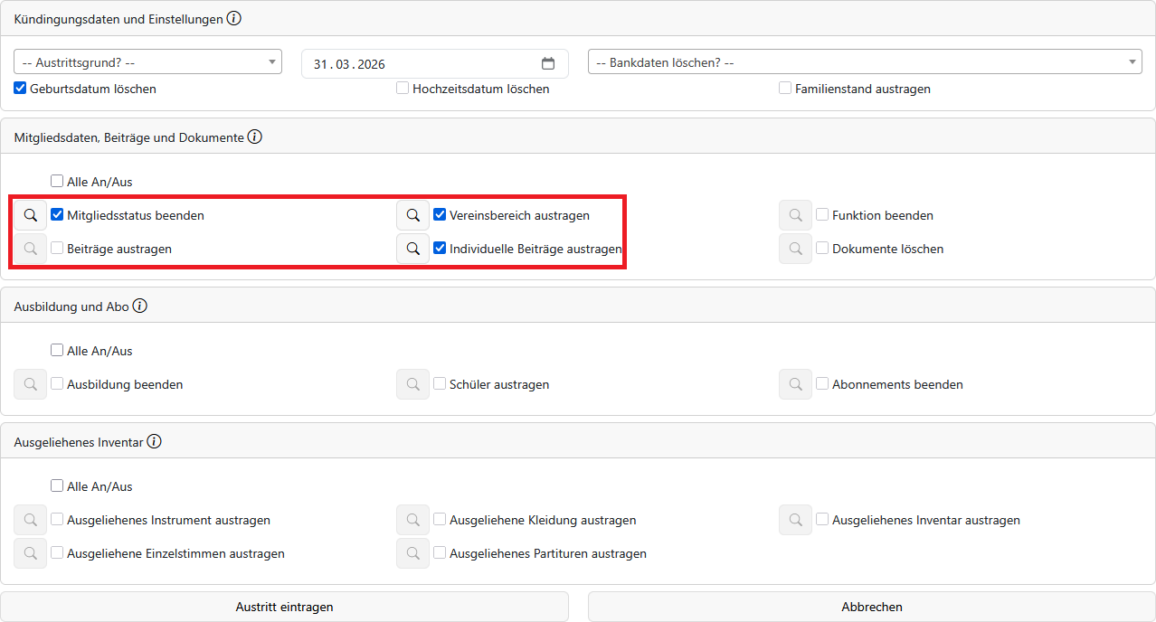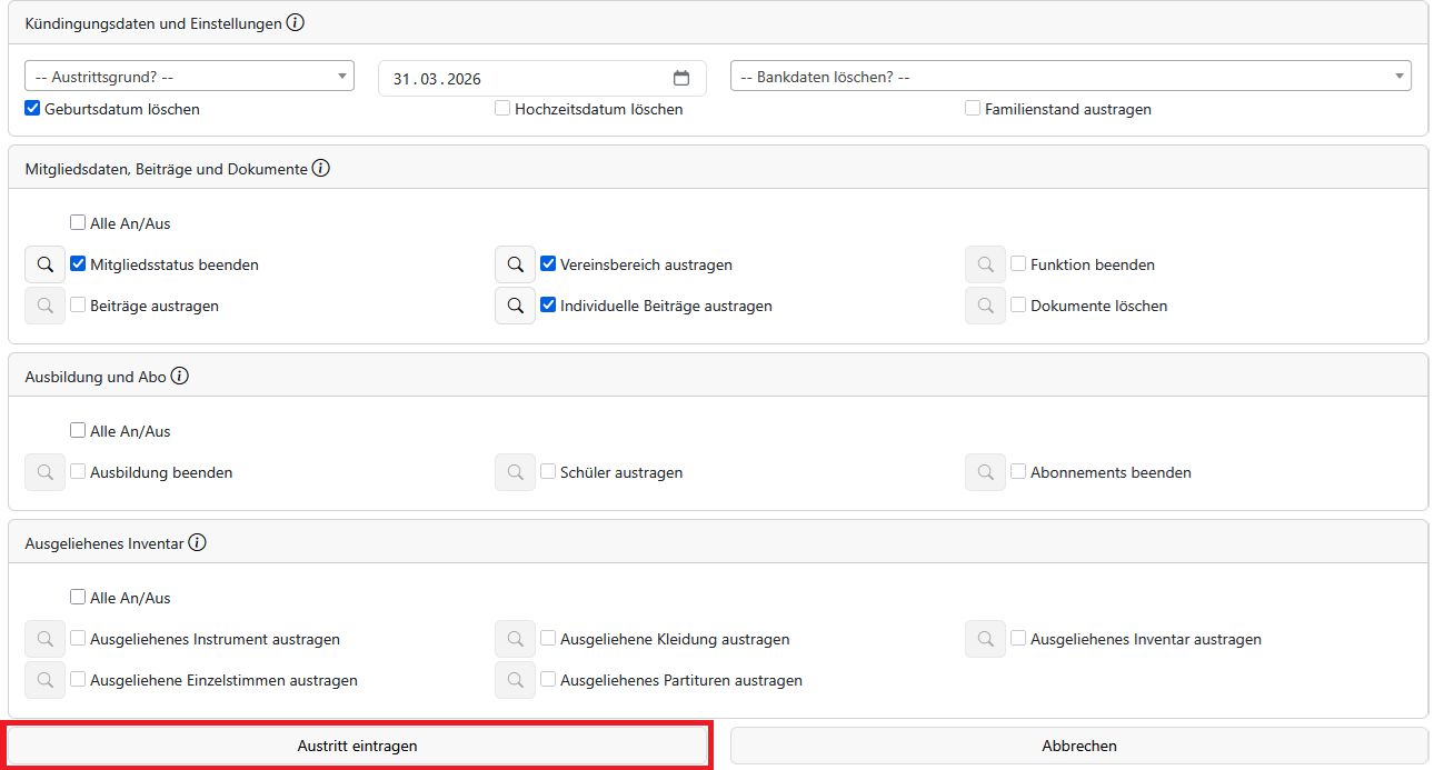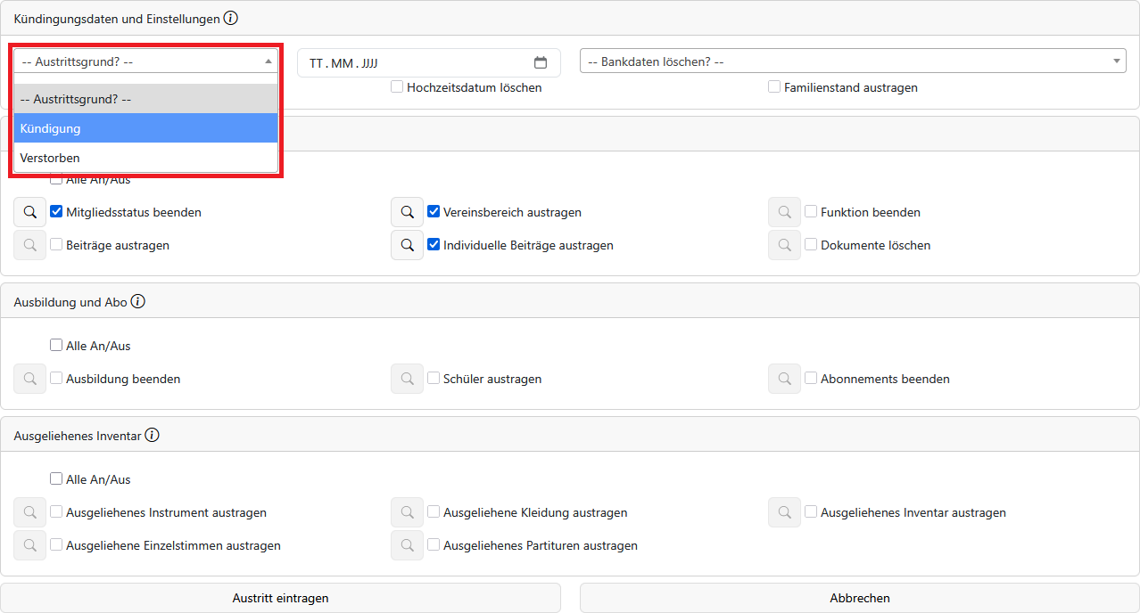 Wenn ein Mitglied austreten möchte oder verstorben ist, können Sie den Austrittsassistenten verwenden, um das Mitglied auszutragen.