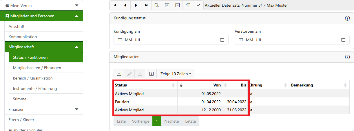 Wenn ein Mitglied pausiert, fällt es für die Zeit der Pause aus dem Ehrungsanspruch heraus. Um dies korrekt vom Programm berücksichtigen zu lassen, muss die Pause auch korrekt hinterlegt sein.