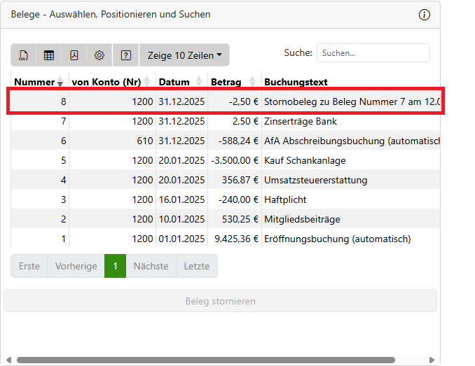 In den Belegen sehen Sie danach, dass ein Stornobeleg eingefügt wurde. Damit ist die Stornierung abgeschlossen.