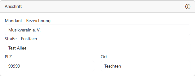 Hier wird die Anschrift zum Mandanten hinterlegt. Pflichteingabe ist hier nur das Feld "Mandant - Bezeichnung".