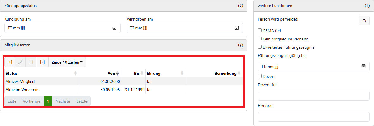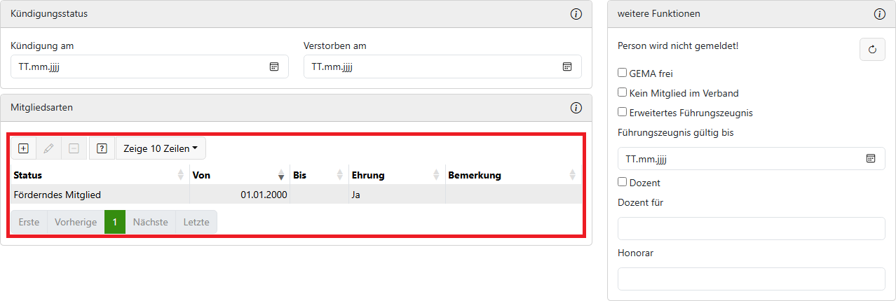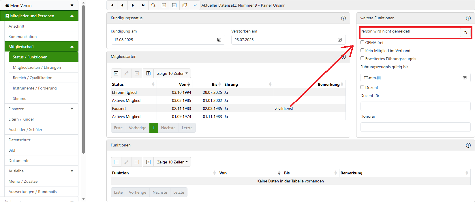 Im Reiter "Status / Funktionen" gibt es einen Hinweistext, der anzeigt, ob ein Mitglied gemeldet wird oder nicht.