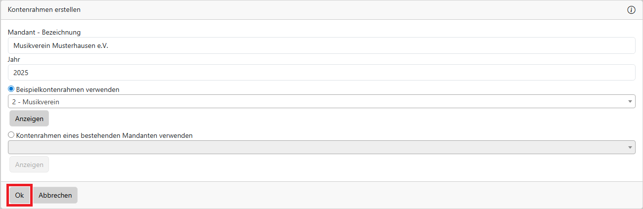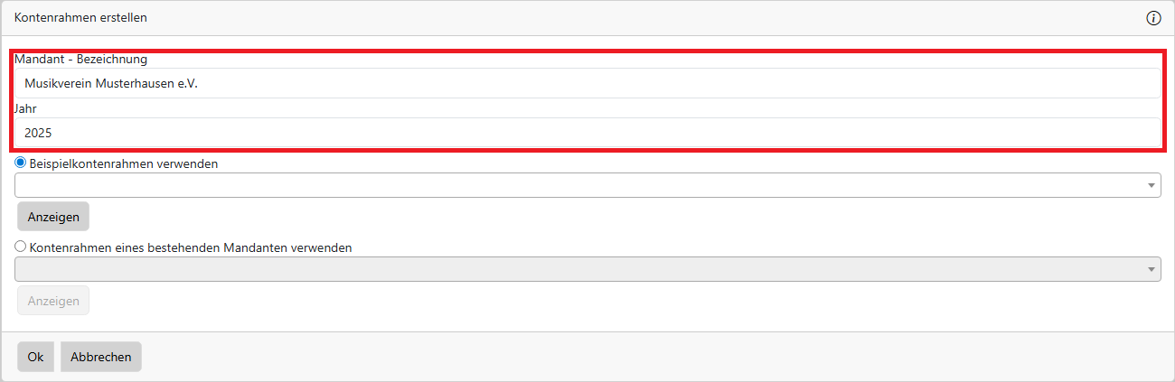 Tragen Sie den Namen und das Jahr für den Mandanten ein, den Sie in der Buchhaltung anlegen wollen.