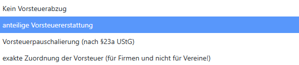 Mögliche Einstellungen für die Vorsteuererstattung: