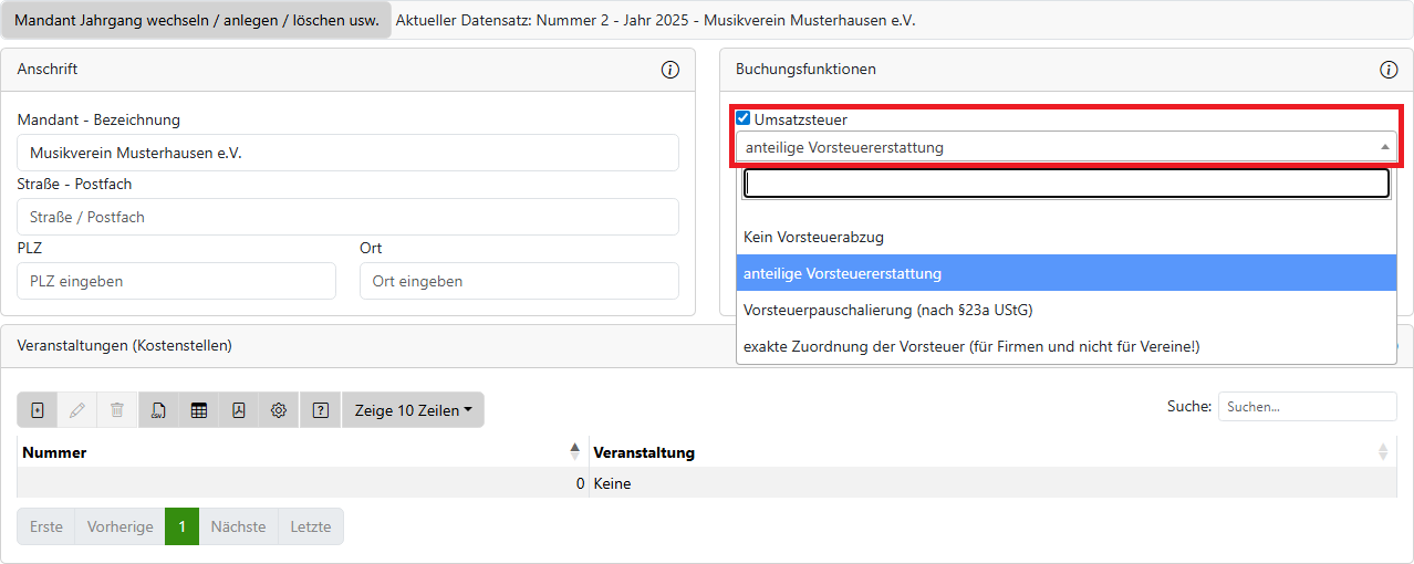 Ob Ihr Verein umsatzsteuerpflichtig und welche Einstellung für Sie korrekt ist, können Sie im Zweifelsfall mit dem Finanzamt abstimmen. in den häufigsten Fällen ist es in Vereinen die anteilige Vorsteuererstattung und wird daher automatisch voreingestellt.