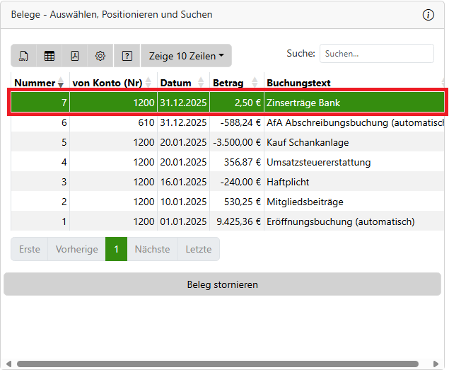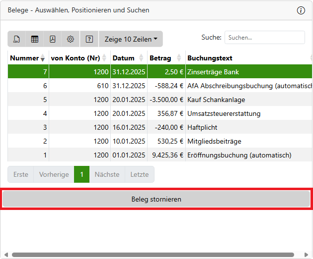 In den Belegen sehen Sie danach, dass ein Stornobeleg eingefügt wurde. Damit ist die Stornierung abgeschlossen.