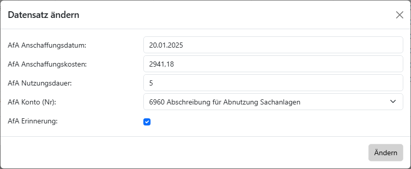 Diese Angaben müssen nur einmal - im Jahr der Anschaffung - gemacht werden. In den Folgejahren funktioniert die Abschreibung automatisch.