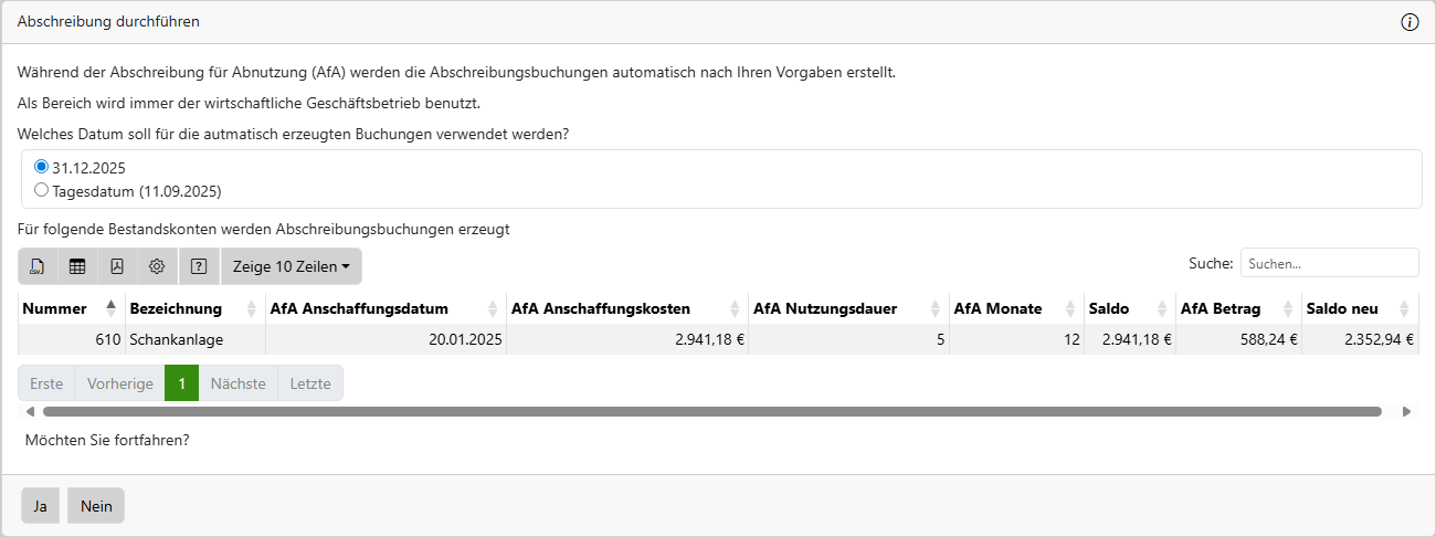 die automatischen AfA-Buchungen durchgeführt. Dazu werden Ihnen die Abschreibungen wie folgt angezeigt: