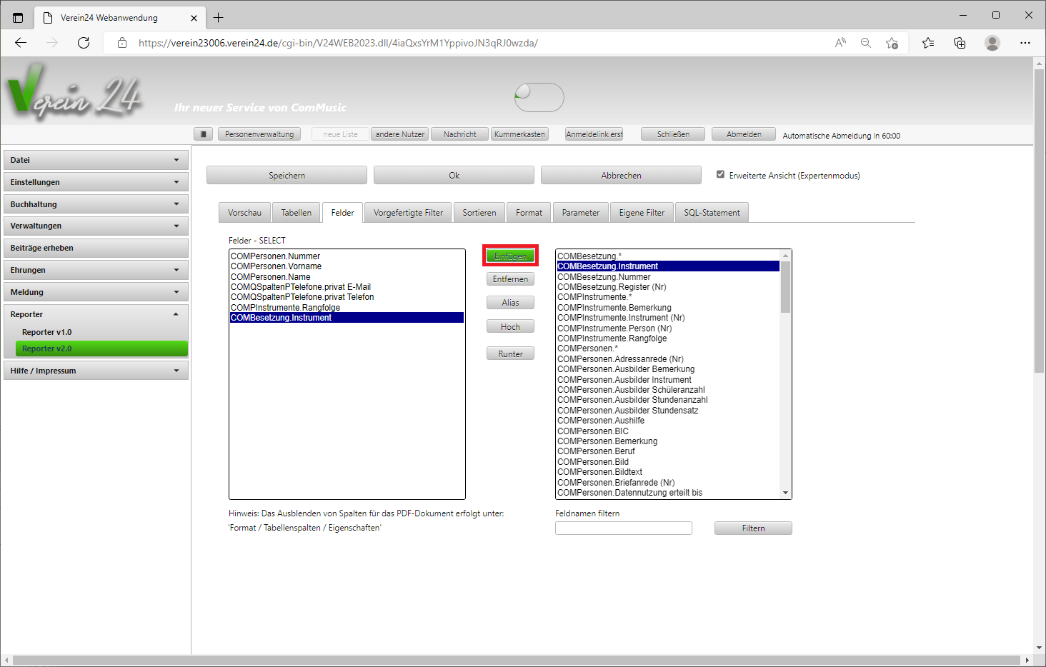 Gehen Sie in den Reiter Felder und fügen Sie nun die Felder "Instrument" aus der Tabelle COMBesetzung und "Rangfolge" aus der Tabelle COMPInstrumente ein.